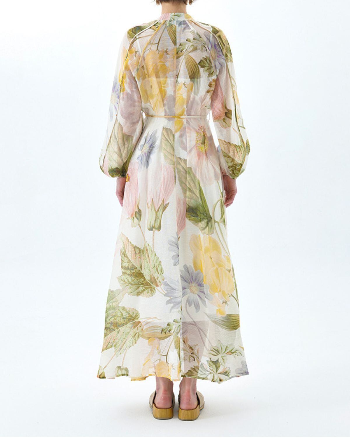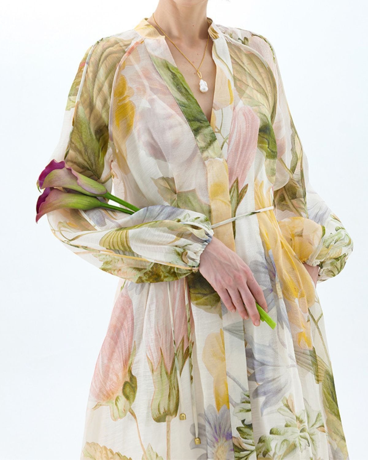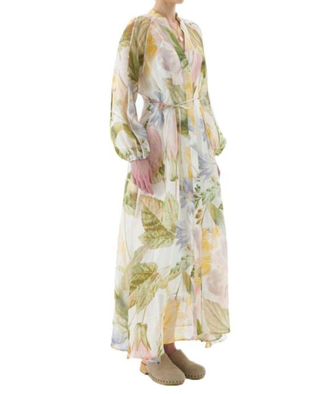 淡いパステルカラーの大胆なフローラルプリントのワンピース。Vネックラインとボタン留めのシャツドレススタイルになっています。ウエストをマークするロープベルトでスタイル良くエレガントに着こなせます。