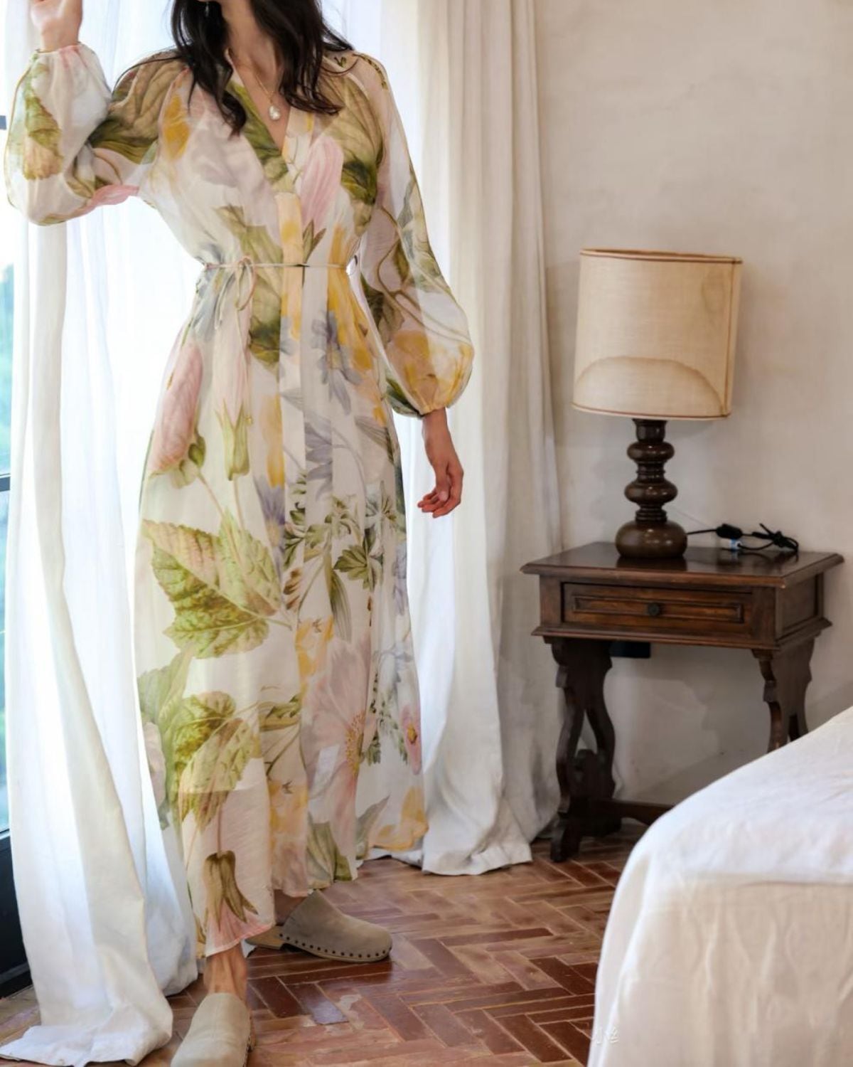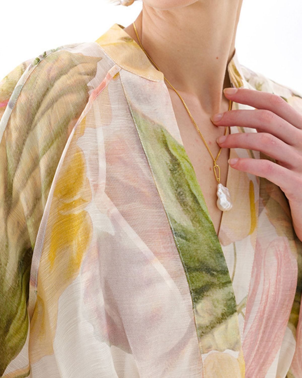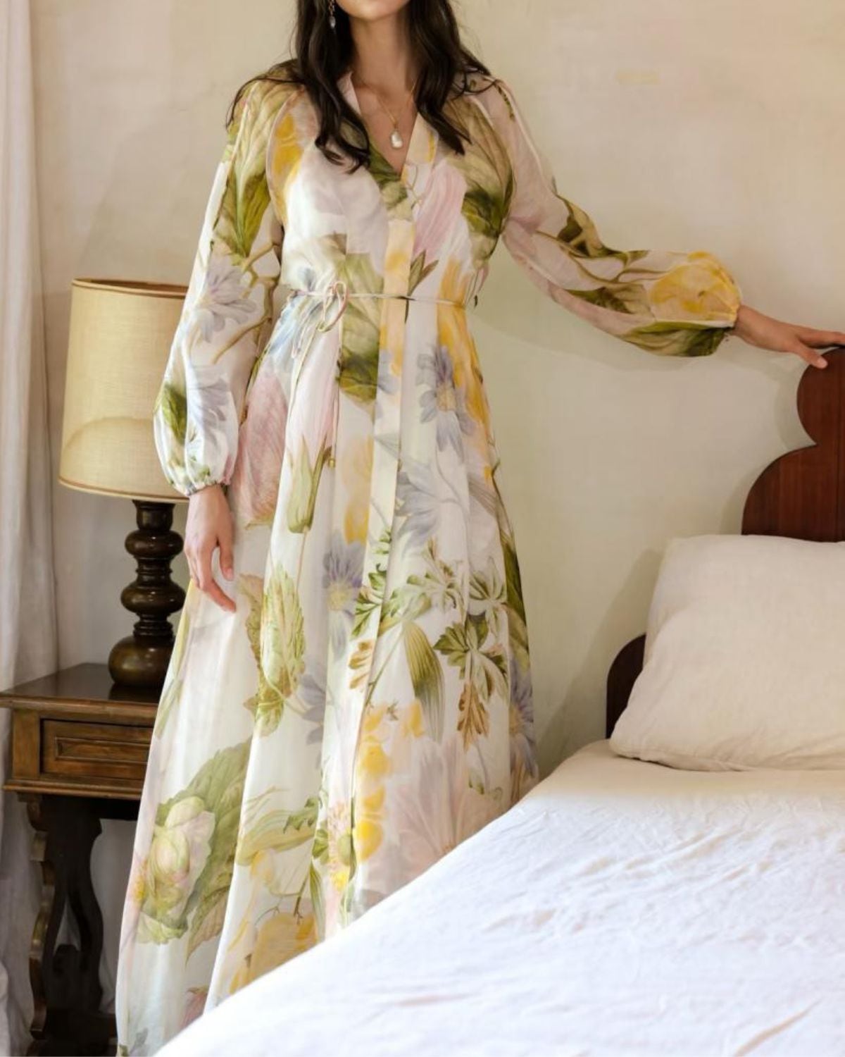 淡いパステルカラーの大胆なフローラルプリントのワンピース。Vネックラインとボタン留めのシャツドレススタイルになっています。ウエストをマークするロープベルトでスタイル良くエレガントに着こなせます。