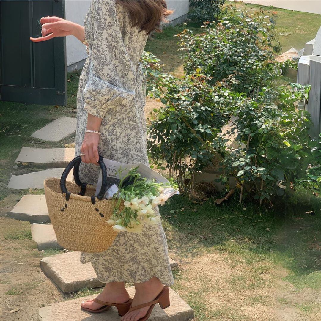 落ち着いた雰囲気の小花柄ワンピース。Vネックで首回りをすっきりさせウエストマークでスタイル良く魅せます。