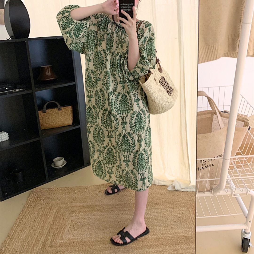ボヘミアン花柄パフスリーブワンピース 2785