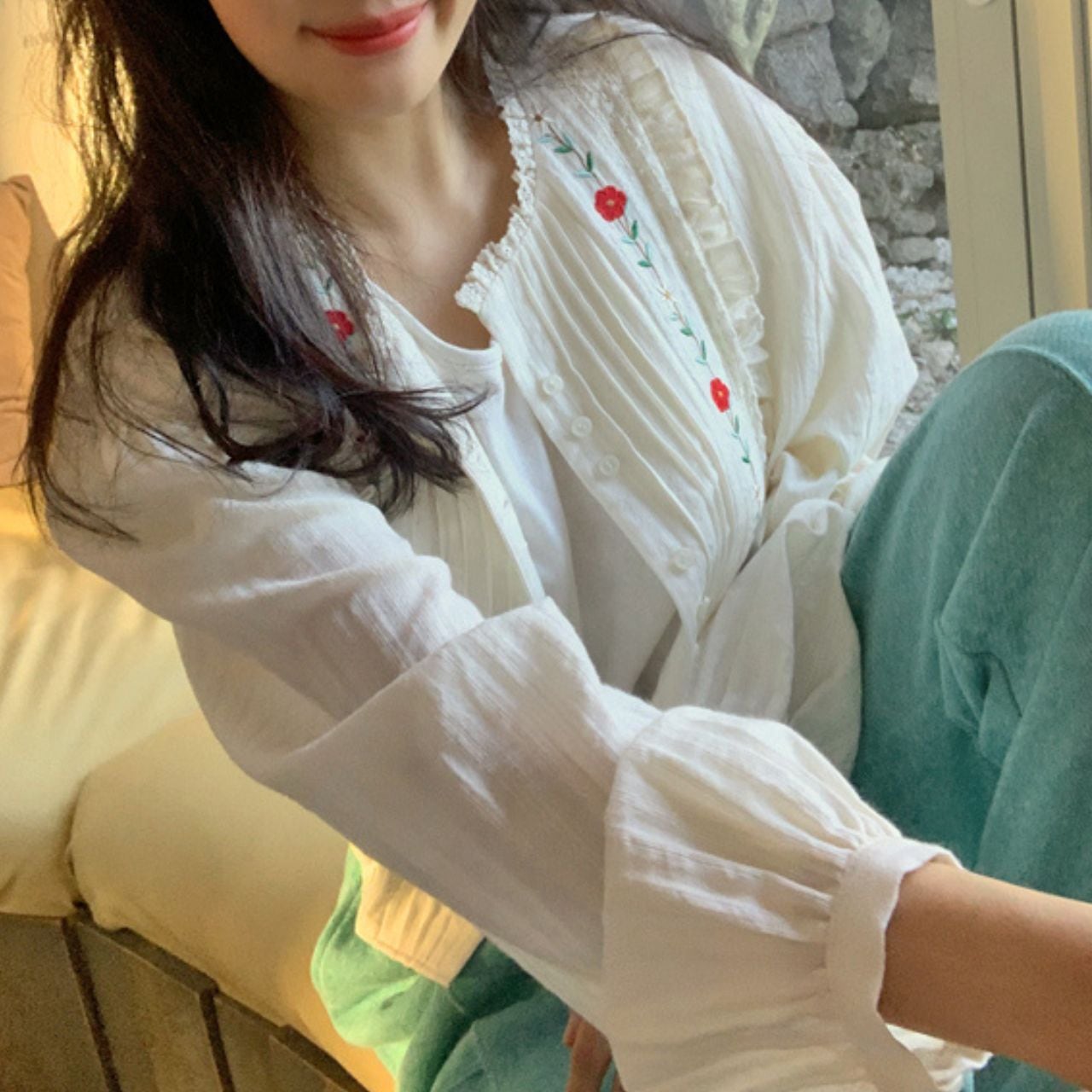 タックフリルフラワー刺繍長袖ブラウス 2953
