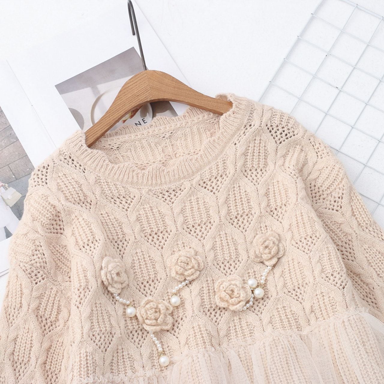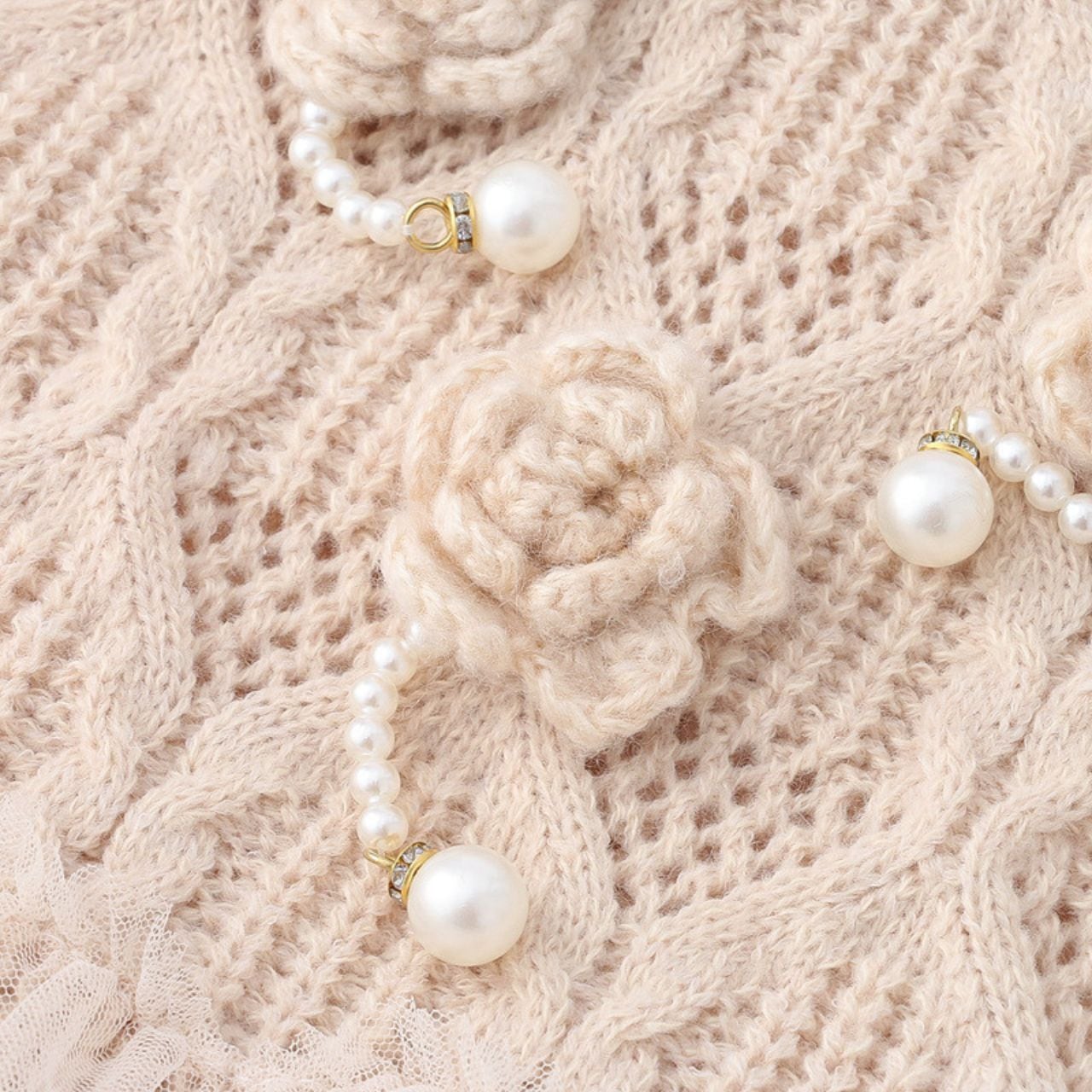 パールをあしらったローズコサージュが優雅な雰囲気を醸し出すニットセーター。