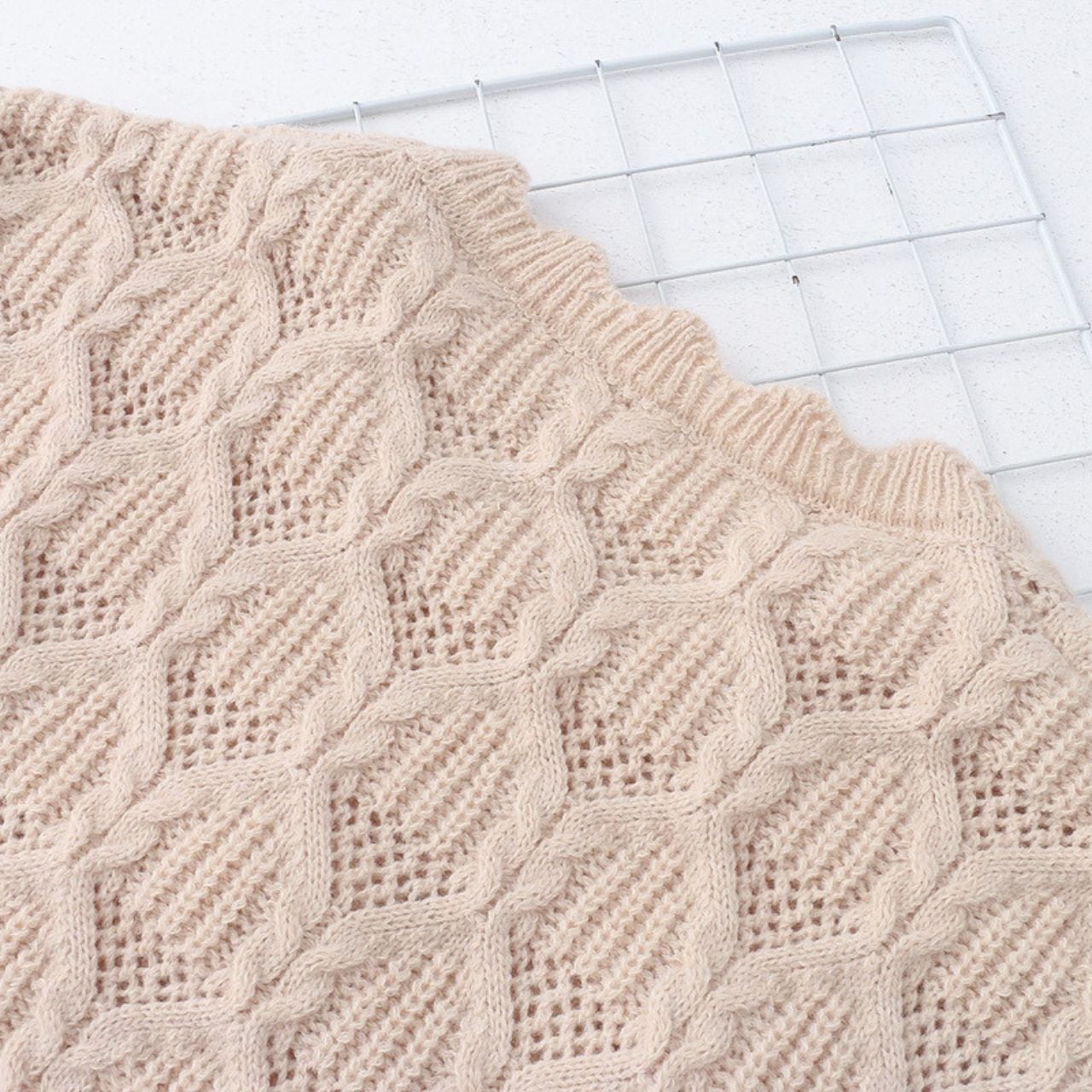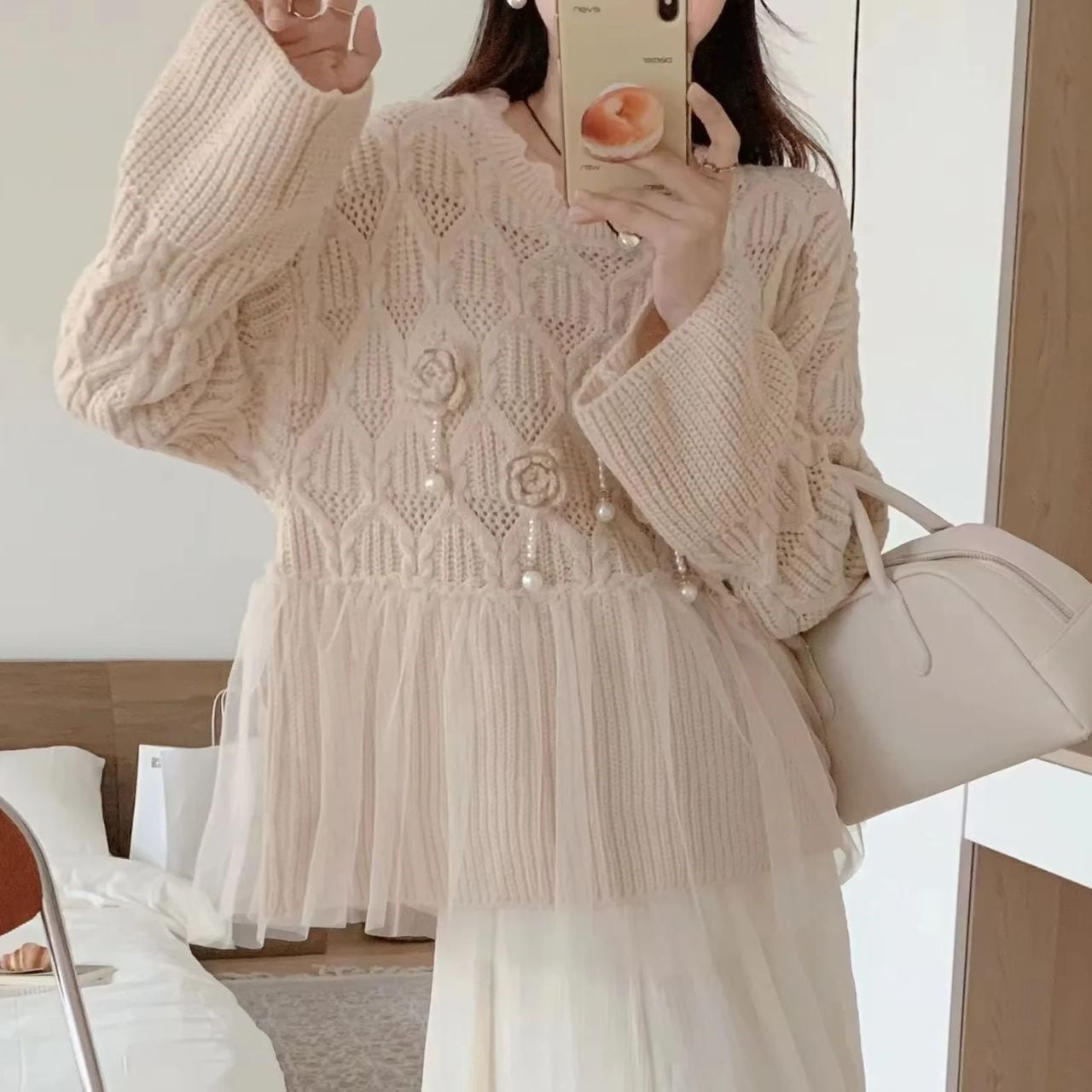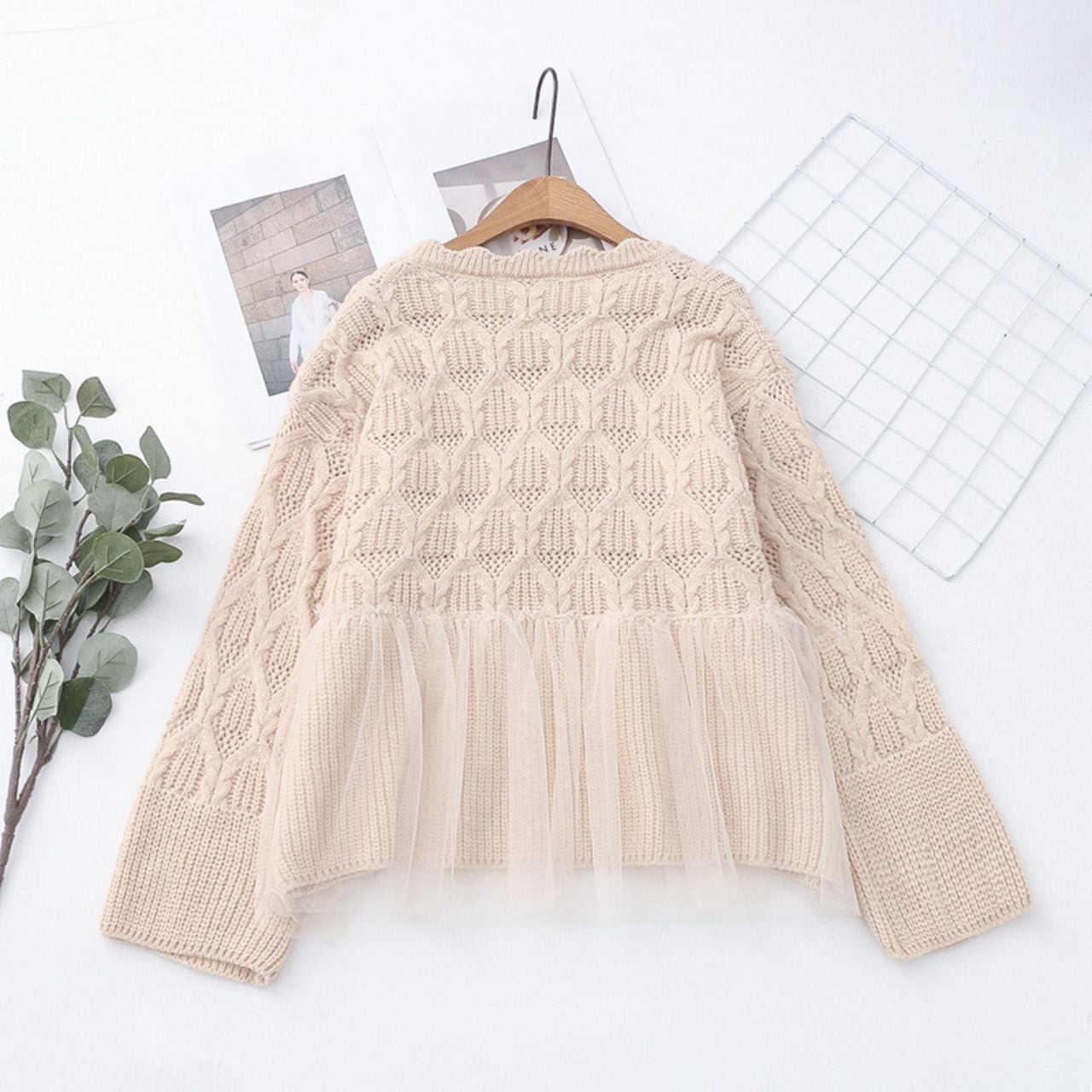 柔らかなニット素材とチュールフリルの組み合わせが上品な女性の印象を与えます。