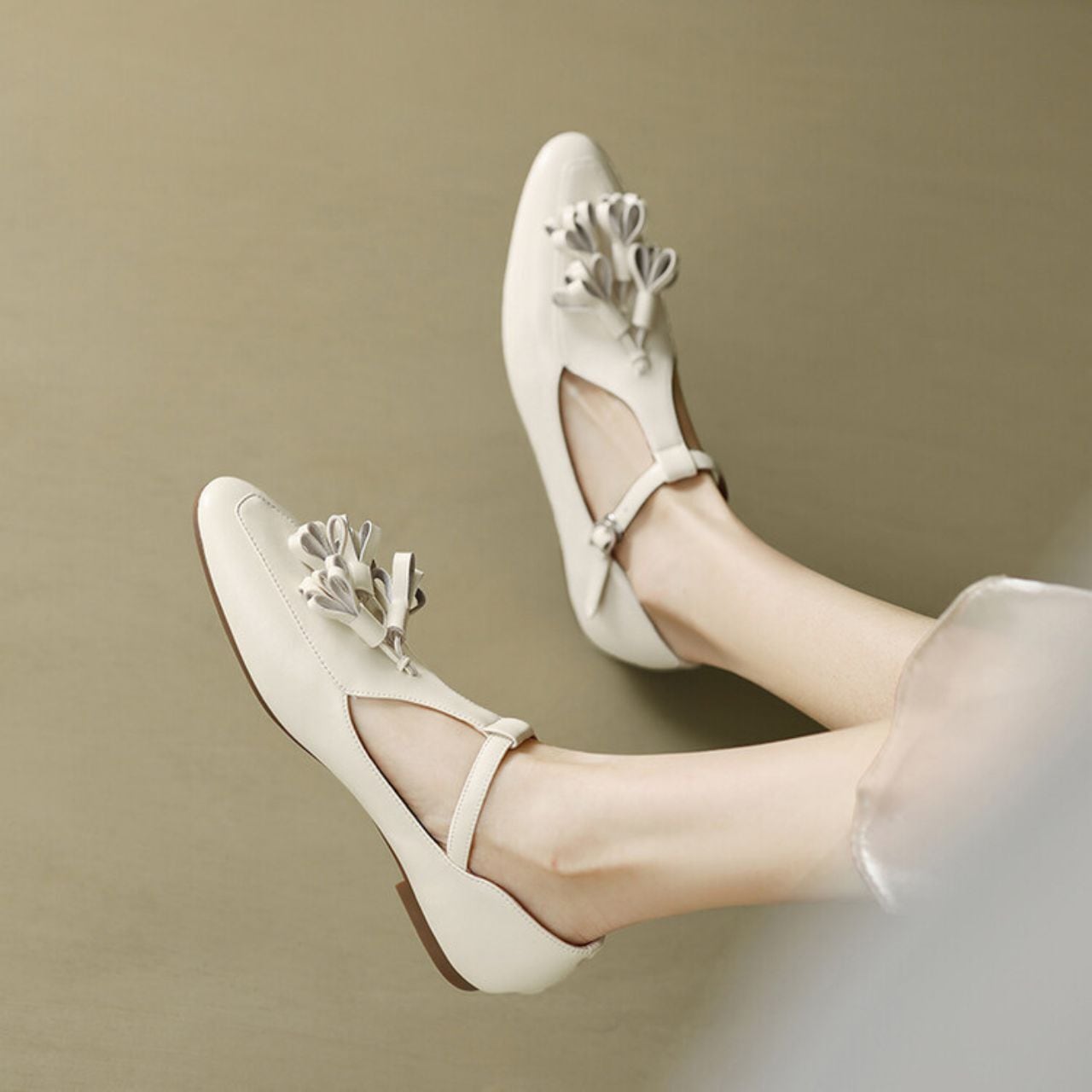 フリンジタッセルが目を惹くT字ストラップパンプス。